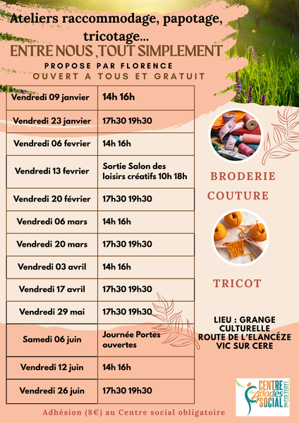 Venez avec votre passion, vos envies, un peu de laine au fil de votre bonne humeur et Florence vous accompagnera pour le reste ! Gratuit, mais adhésion au Centre social obligatoire.